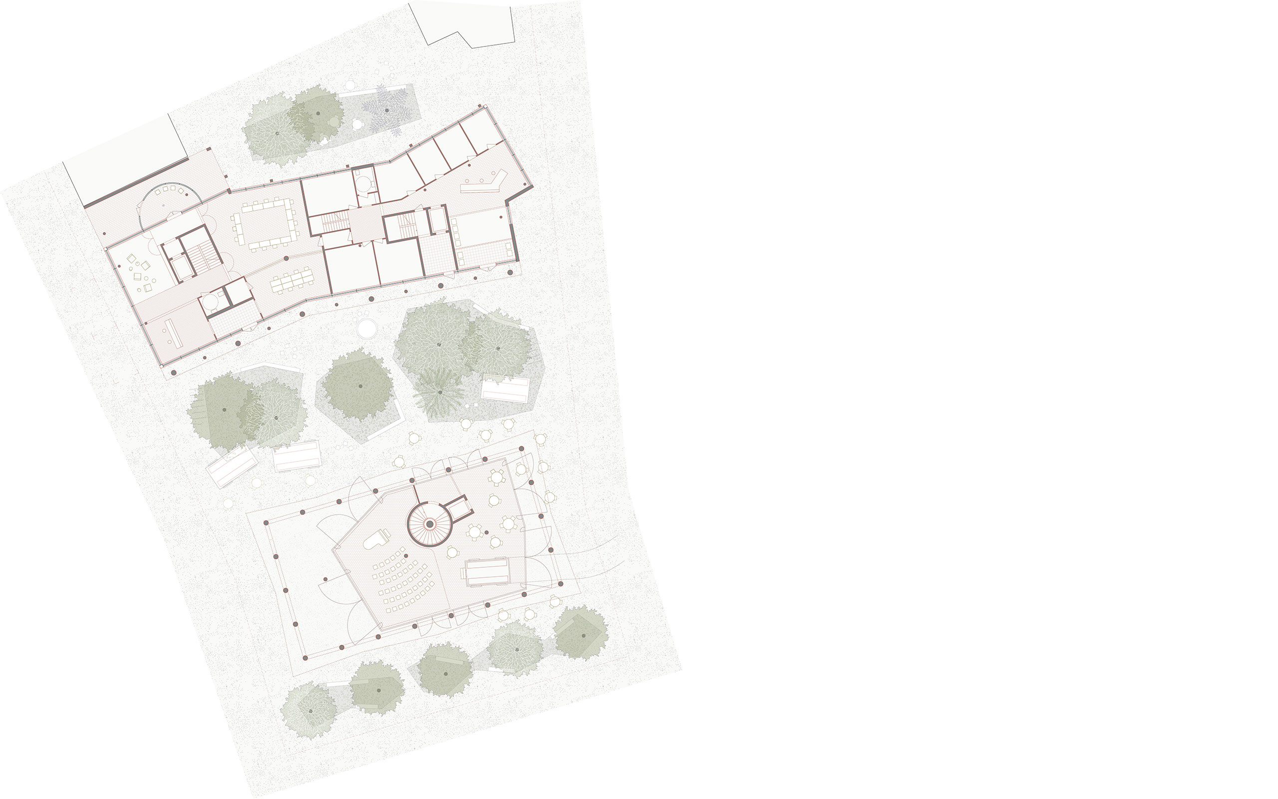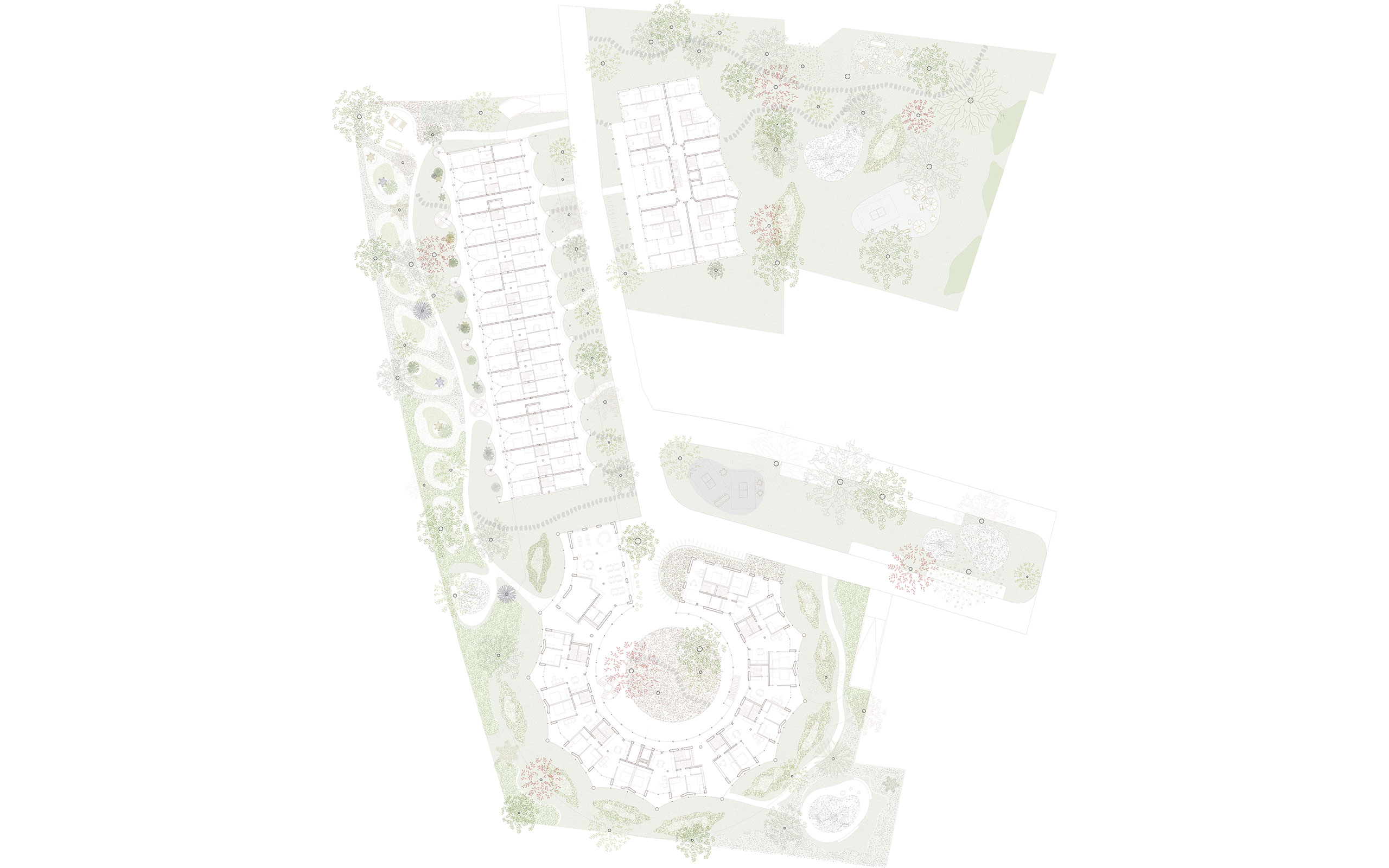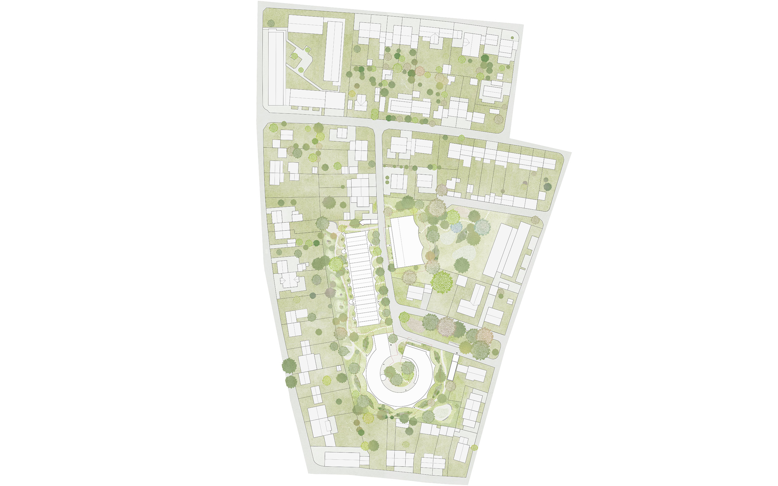 Drei eigenständige Gebäude ergänzen den fragmentierten Block zu einem schlüssigen Ganzen. Das städtebauliche Konzept folgt damit den in dieser Gegend typischen Blockbebauungen mit erkennbaren Häusern, die sich in die Tiefe erstrecken und diese mit präzisen Lücken vom Stadtraum aus wahrnehmbar machen. Dadurch wird das innere Grün der Höfe bis in den Straßenraum wirksam. Dieses Prinzip geht auf die Vision Theodor Fischers zurück; sie schafft angenehm poröse Blöcke, die Schwabing seine charakteristische Prägung geben und sie weisen enorme Qualitäten auf: Die Korrespondenz zwischen dem Blockinneren und den Straßenräumen lässt die innere, heterogene Welt der Blöcke erahnen.