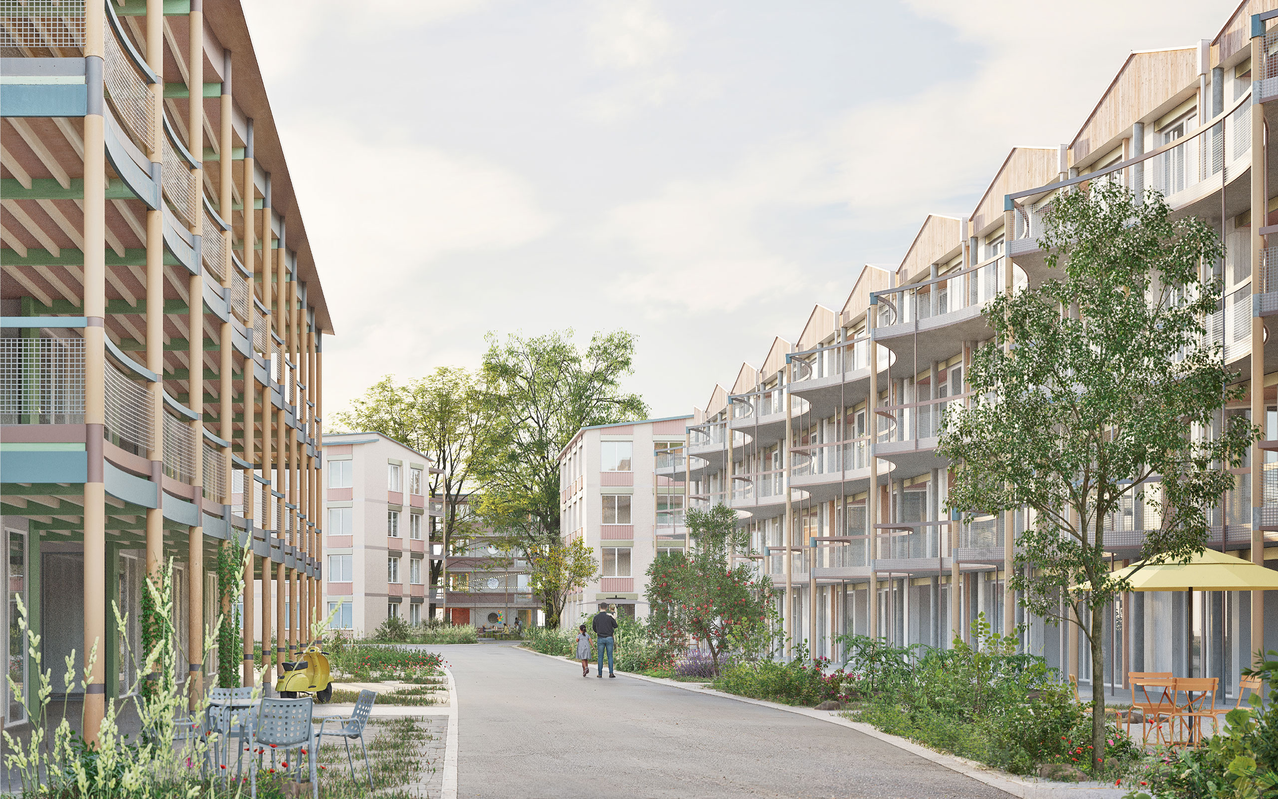 Die Fassaden sind in der Grundstruktur einfach gegliedert, die Öffnungen variieren leicht von unten nach oben. Sie geben den Fassadenfronten eine klare Ordnung, die in der zweiten Ebene verfeinert wird: So schafft ein leichtes Relief ein komplexes Spiel von Schatten, sanfte, differenzierte Putzstrukturen ergeben textile Qualitäten. Dazu kommen feine, lasurartige Farbaufträge. In der Summe entsteht ein entspanntes Spiel von Varianz und Ordnung, das den Gebäuden Präsenz und Würde, und nicht zuletzt eine unaufgeregte Einbindung in die Umgebung verleiht.