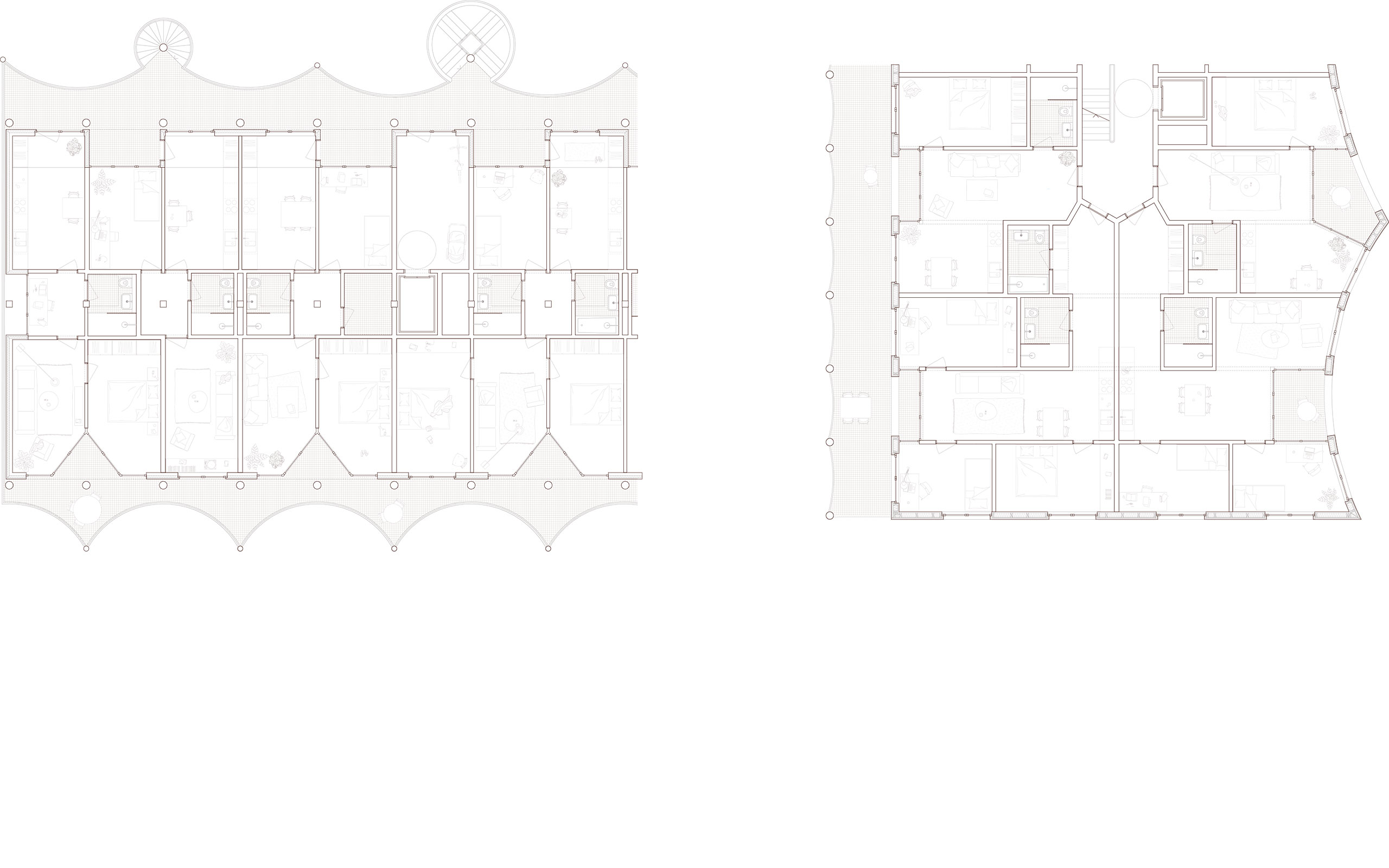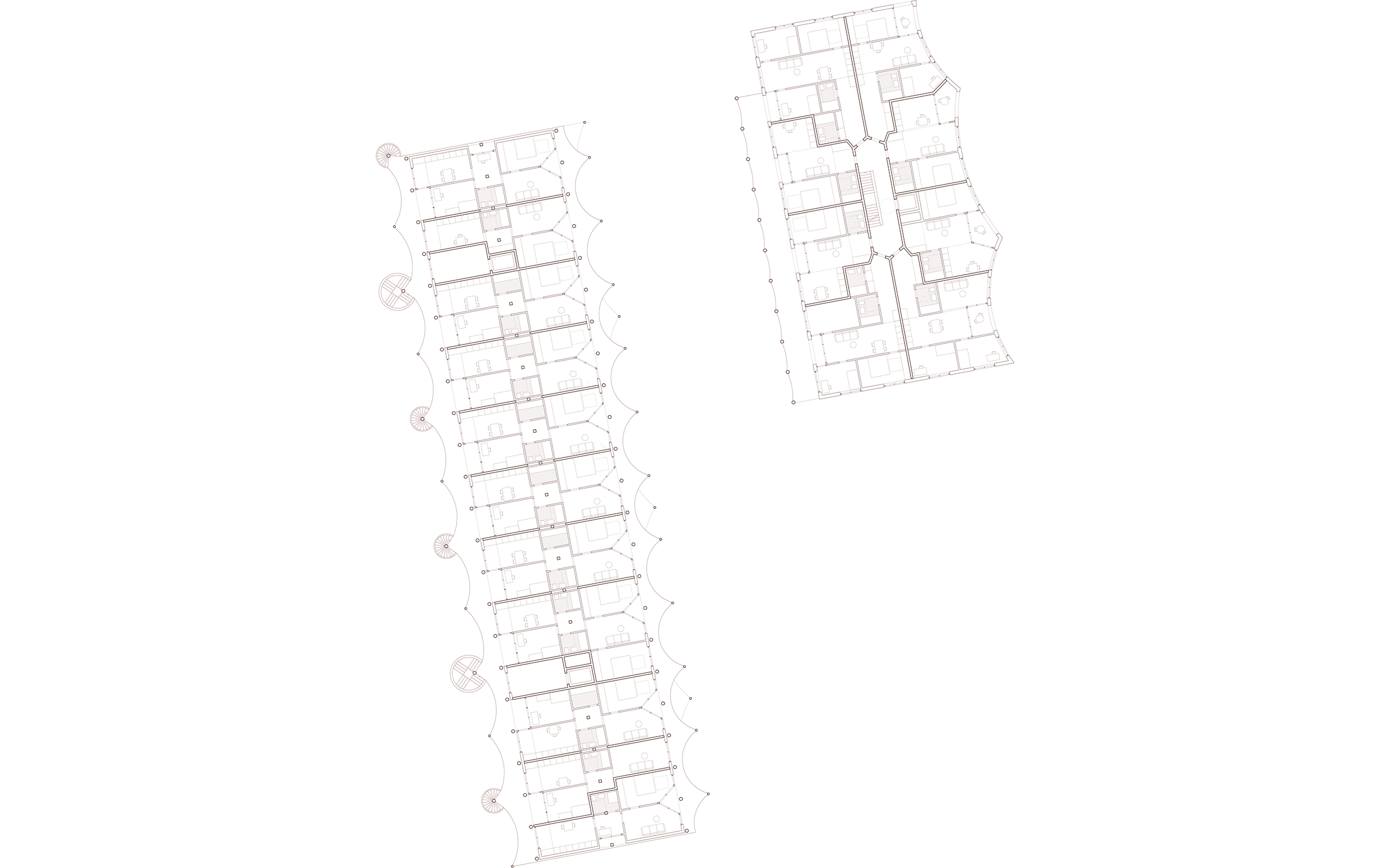 Die einzelnen Gebäude reagieren auf die jeweiligen Erfordernisse und Nutzungen. Sie sind untereinander verwandt, jedoch mit einer Varianz im Ausdruck und mit einer gewissen Autonomie bezüglich der Nutzung der Geschosshöhen und der Struktur.