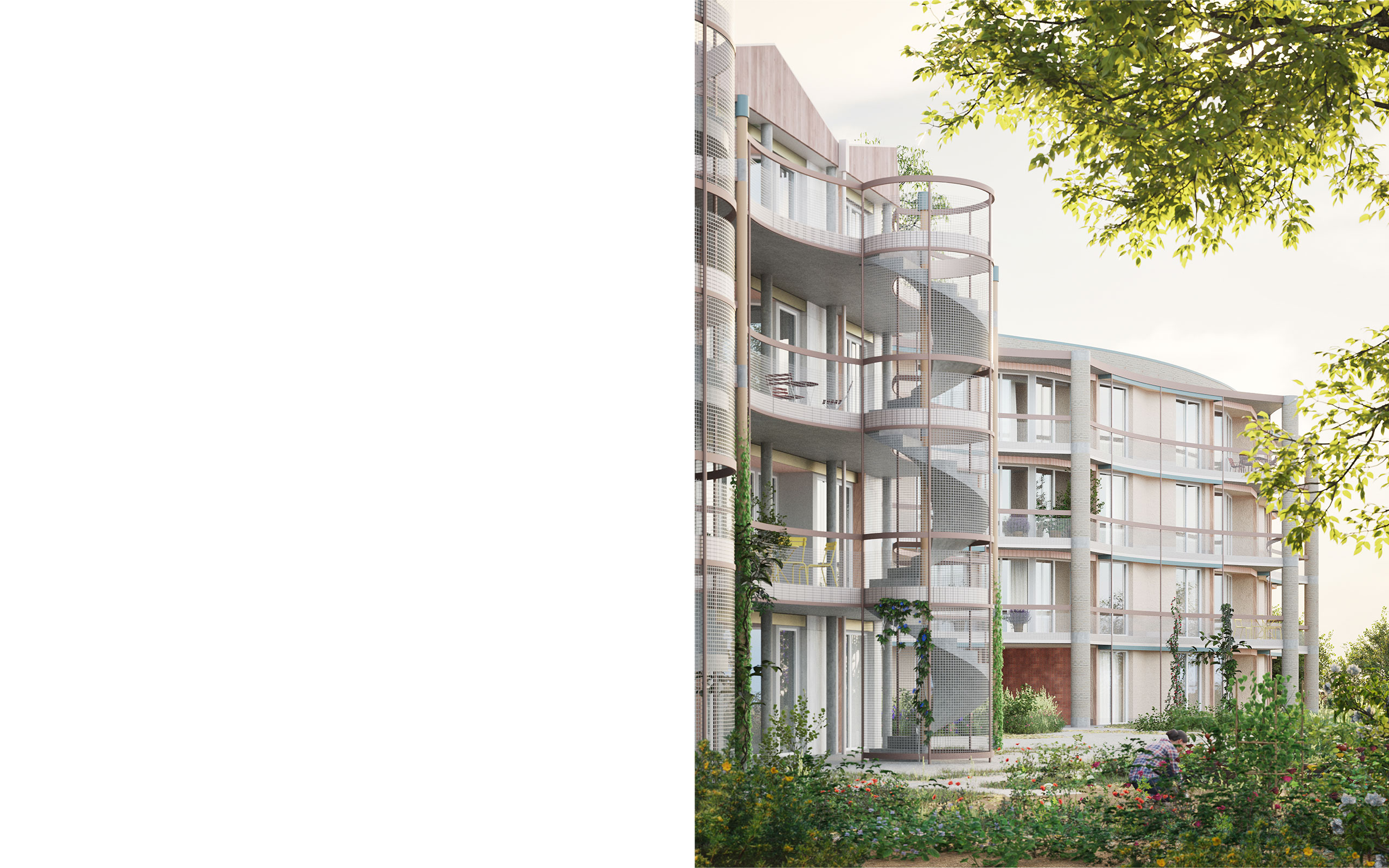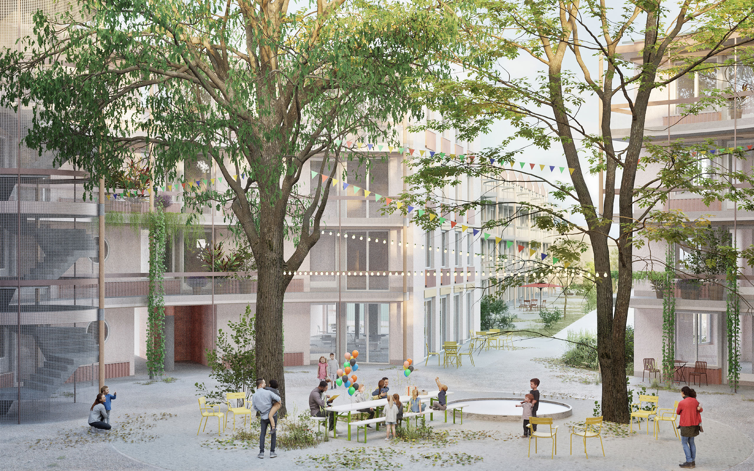 Die Freistellung der Häuser ergibt hohe Wohnqualitäten durch zahlreiche mehrseitig ausgerichtete Eckwohnungen, komplexe Beziehungen nach innen und außen entstehen, auch Wohnungen im Hof erhalten weite Blickachsen.